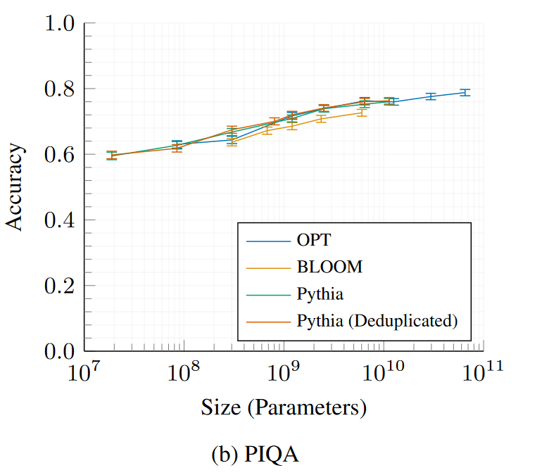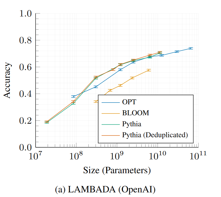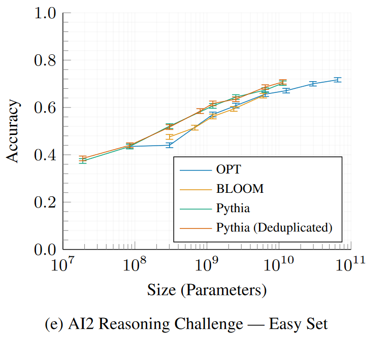 Expand the sections below to see plots of evaluation results for all Pythia and Pythia-deduped models compared with OPT and BLOOM.