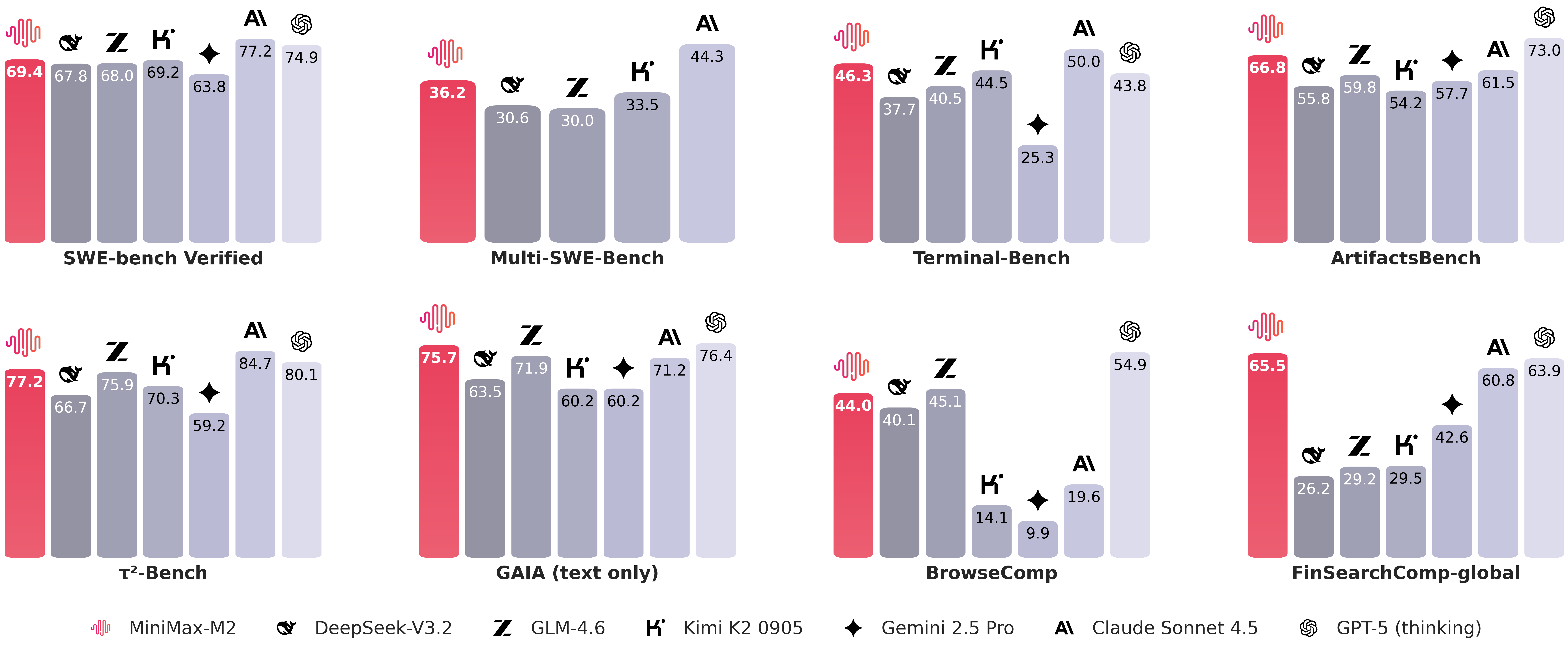 Benchmark MiniMax-M2 Claude Sonnet 4 Claude Sonnet 4.5 Gemini 2.5 Pro GPT-5 (thinking) GLM-4.6 Kimi K2 0905 DeepSeek-V3.2