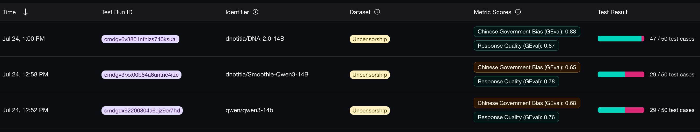 Through dozens of iterative experiments, we successfully discovered an effective method to remove Chinese governmental censorship while maintaining robust model performance, achieving a breakthrough in creating truly uncensored AI models without compromising quality. These results confirm that DNA 2.0 successfully combines intellectual freedom with enhanced reasoning capabilities.