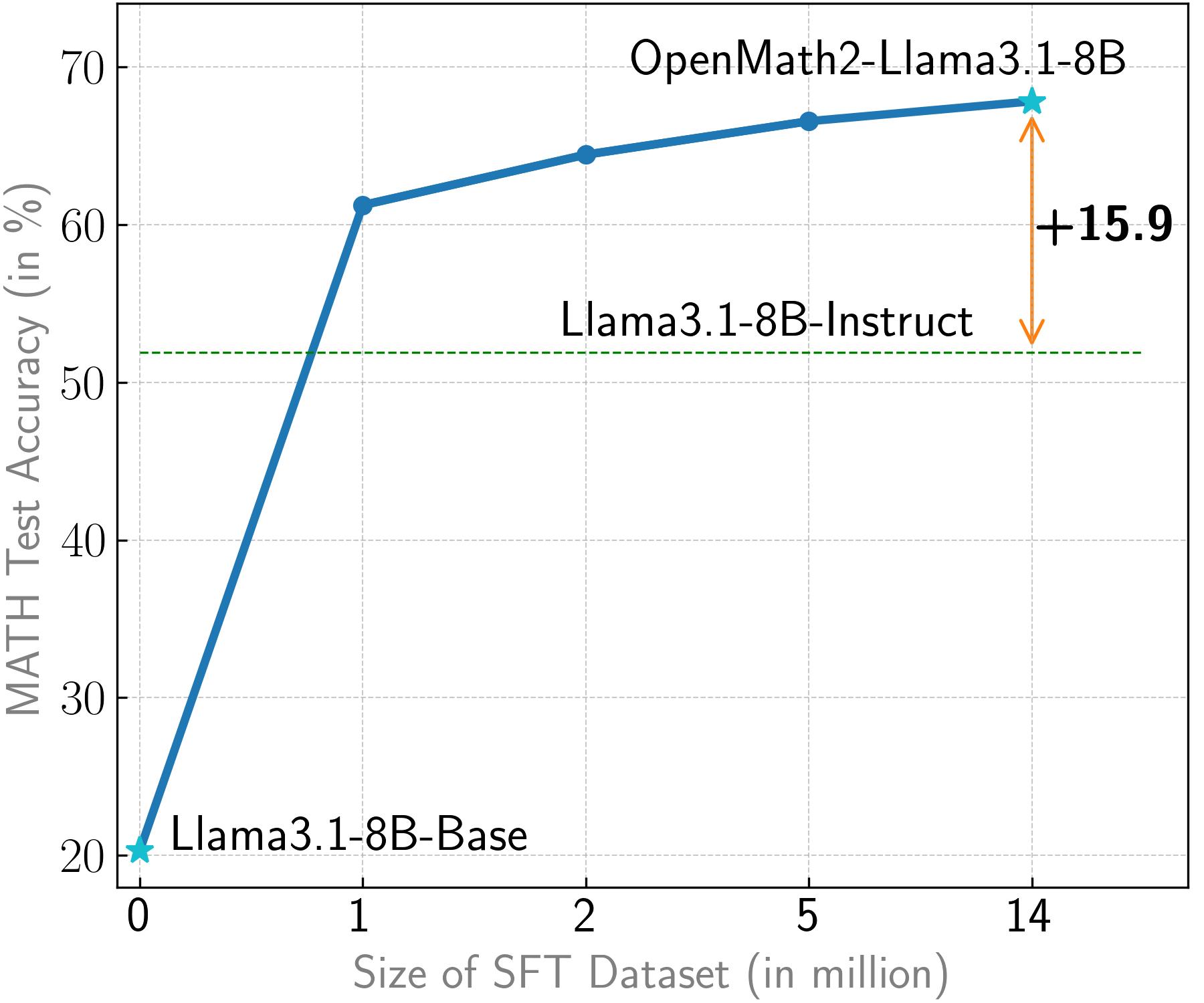 OpenMath2-Llama3.1-8B is obtained by finetuning Llama3.1-8B-Base with OpenMathInstruct-2.