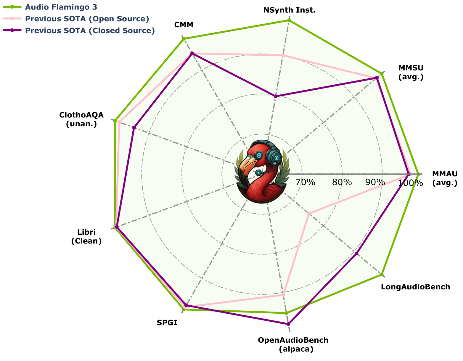 Audio Flamingo 3 (AF3) is a fully open, state-of-the-art Large Audio-Language Model (LALM) that advances reasoning and understanding across speech, sounds, and music. AF3 builds on previous work with innovations in: