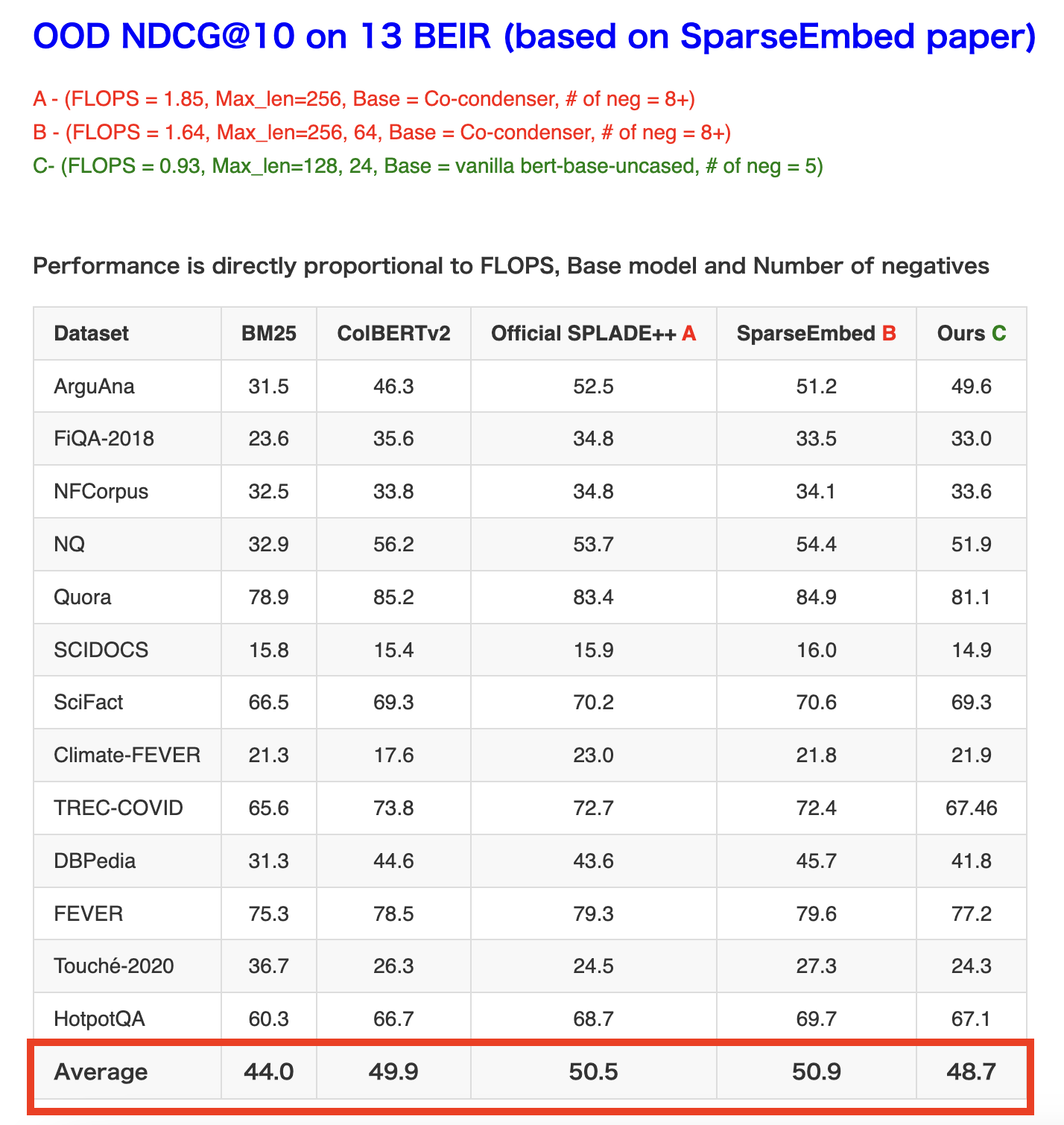 - Same size models: Official SPLADE++, SparseEmbed and Ours all finetune on the same size based model. Size of